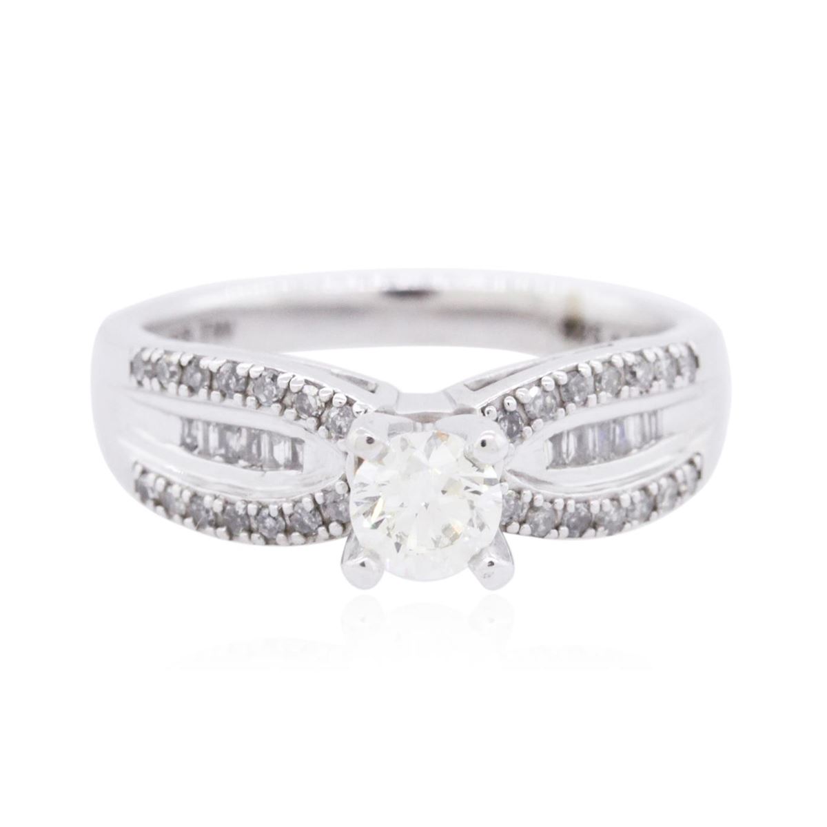 One ring featuring: Silver weighing 4.20 grams containing one prong set round cut diamond center stone with a total weight of 0.45ct and diamond side stones with a total weight of 0.30cts.