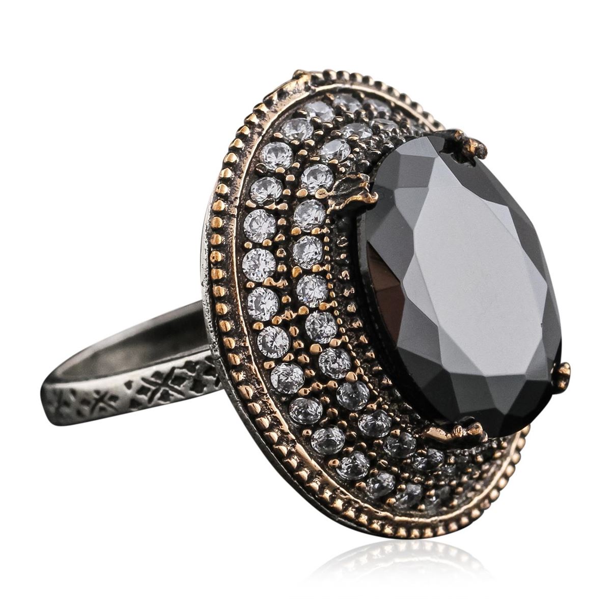 One electronically tested silver cubic zirconia ring. Bright and anodized finish with rope detailing and yellow gold accents. Identified with markings of "925". Condition is new, good workmanship. Containing: One prong set oval brilliant cut laboratory created cubic zirconia, measuring 16.00 x 12.00 x 6.00mm, approximate weight of 13.64ct., black, moderately strong, black color, (GIA Bl 10/4), cut is good. Transmitting light very diffusely, opaque. Graded in the setting. Fifty-six prong set round brilliant cut laboratory created cubic zirconias, measuring 1.90 - 1.80 x 1.20 mm, approximate total weight of 2.80ct., clarity is eye clean, colorless, very slightly grayish, white color, (GIA W 0/3), cut is good. Transmitting light with no distortion, transparent. Color grade is an average for the group. Graded in the setting. Total Weight of Colored Stones 16.44ct. Total Weight of Ring 13.41gm. AIG Appraised at $945.00. AIG Appraised at $945.00.