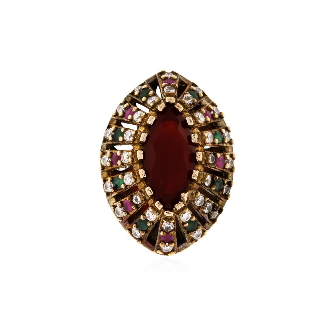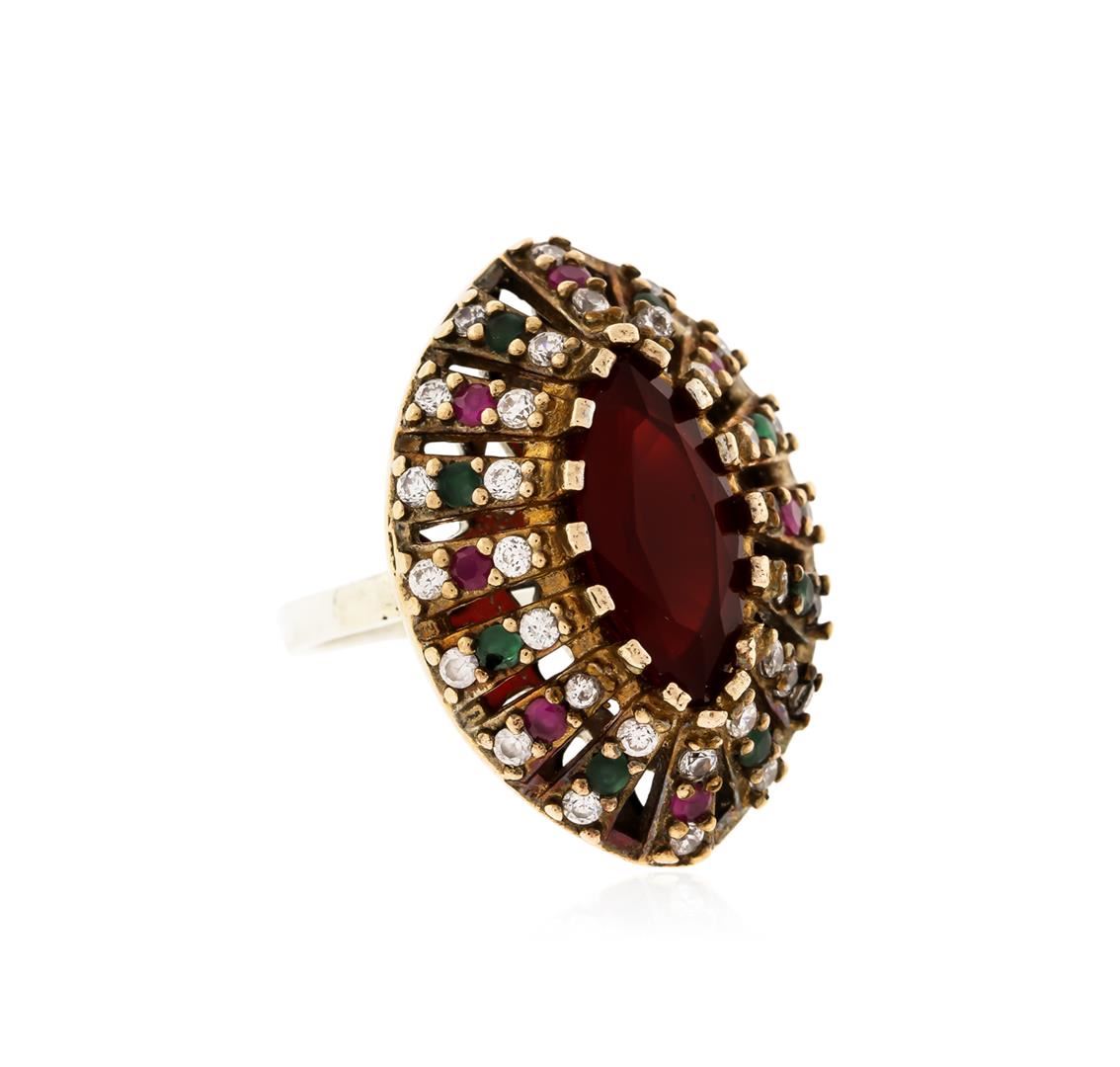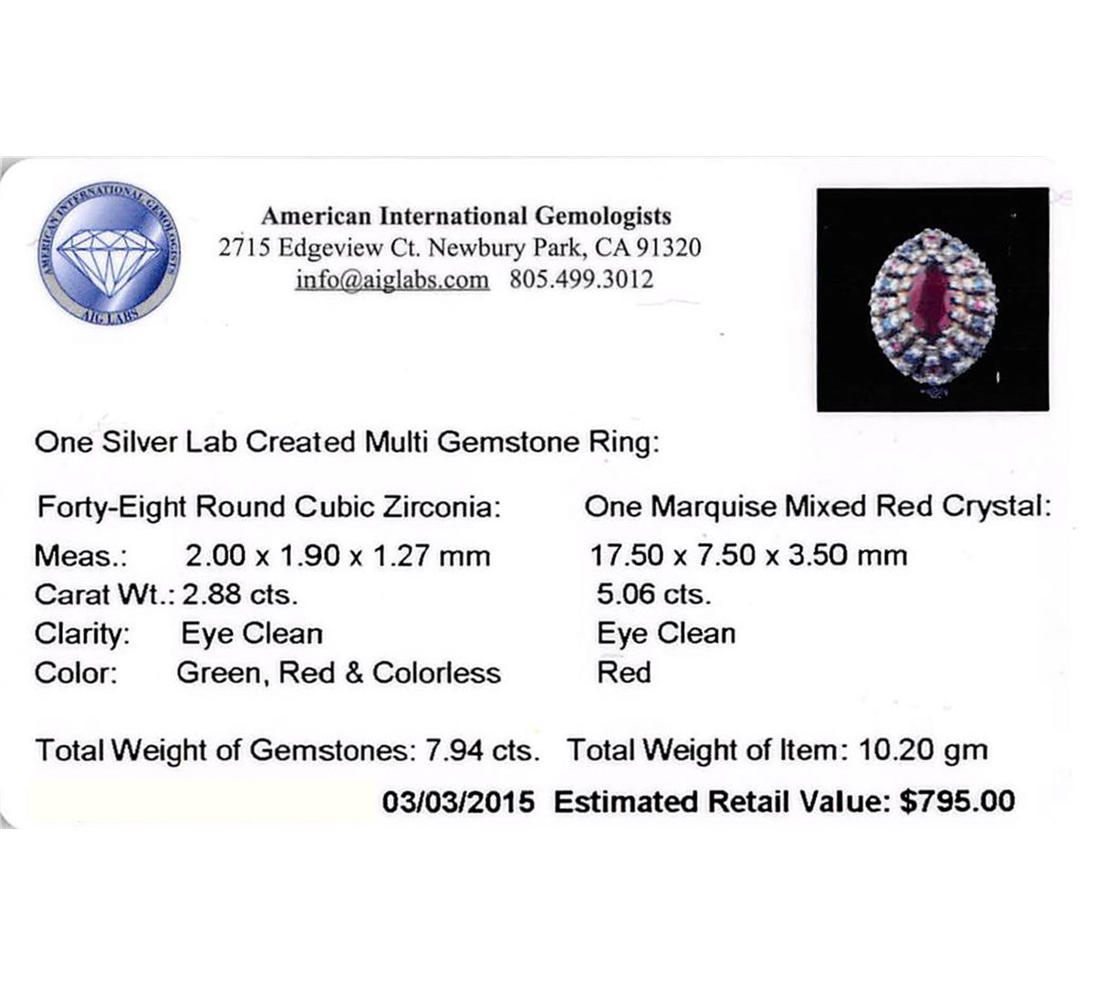 One ring featuring: Silver with a total weight of 10.20 grams containing one marquise mixed red crystal with a total weight of 5.06ct and 48 round multi color cubic zirconia with a total weight of 2.88ct. AIG Appraised at $795.00.