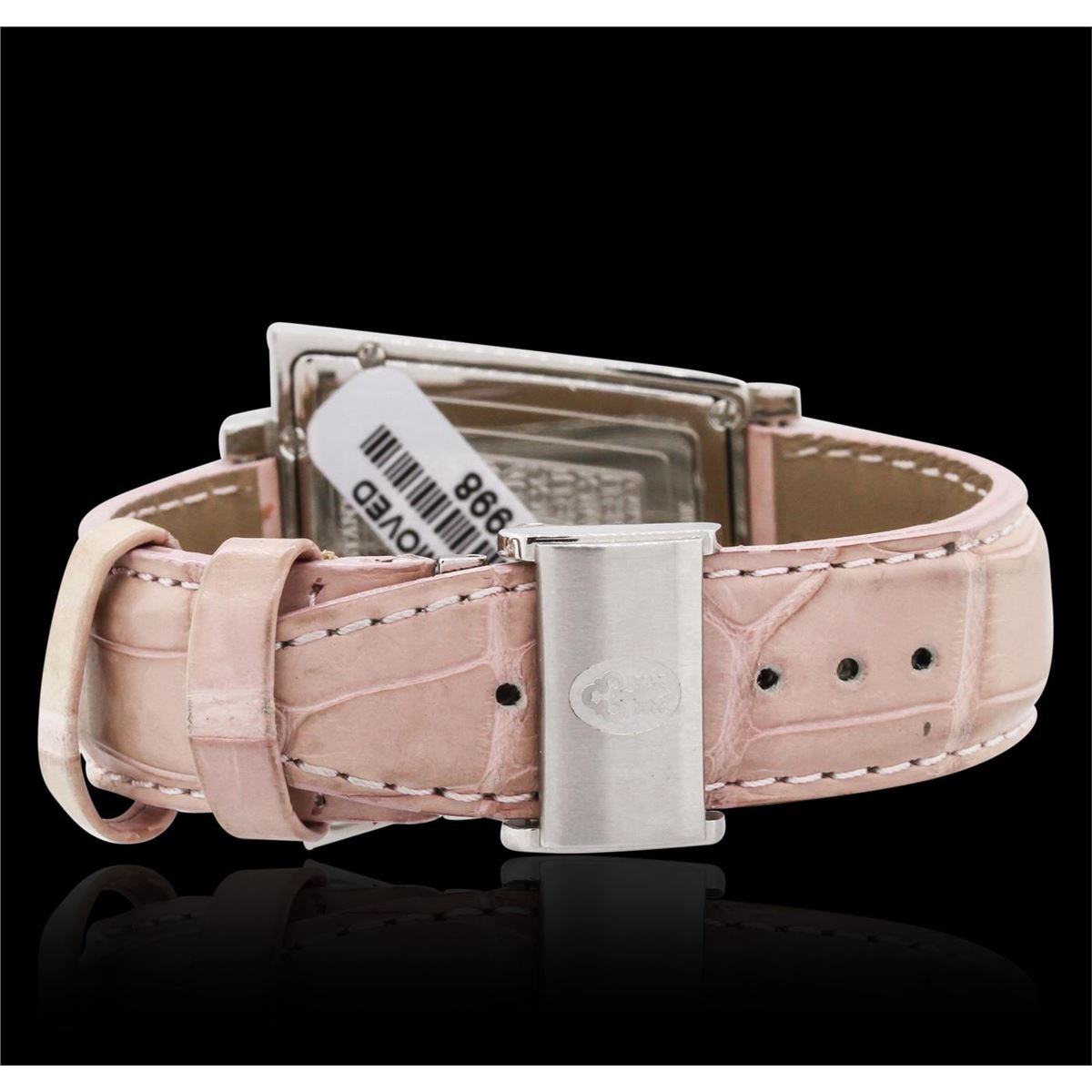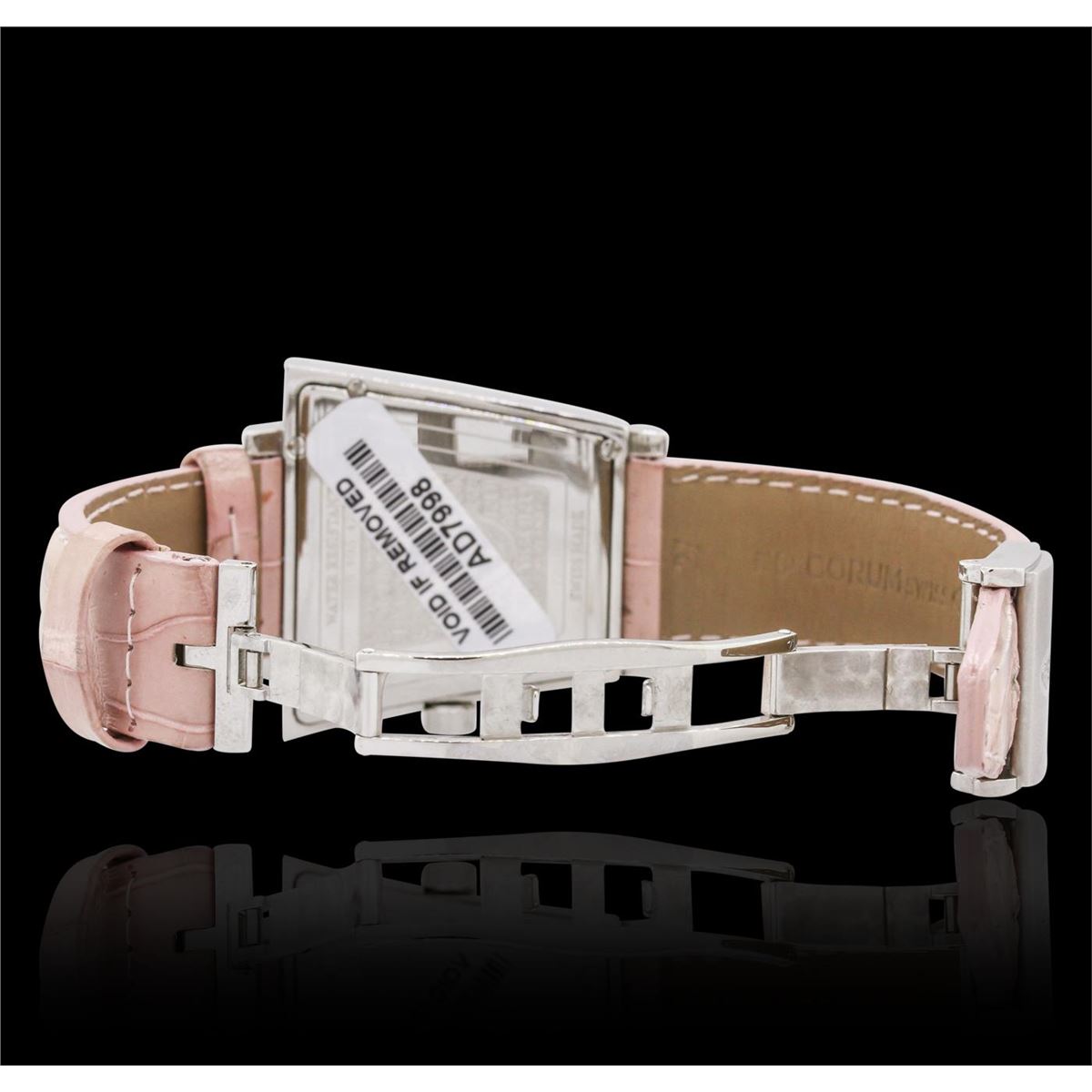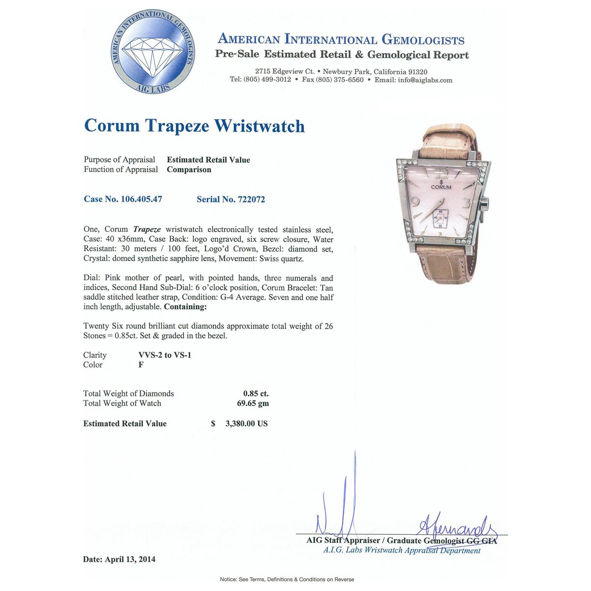 One, Corum Trapeze wristwatch electronically tested stainless steel, Case: 40 x36mm, Case Back: logo engraved, six screw closure, Water Resistant: 30 meters / 100 feet, Logo'd Crown, Bezel: diamond set, Crystal: domed synthetic sapphire lens, Movement: Swiss quartz. Dial: Pink mother of pearl, with pointed hands, three numerals and indices, Second Hand Sub-Dial: 6 o'clock position, Corum Bracelet: Tan saddle stitched leather strap, Condition: G-4 Average. Seven and one half inch length, adjustable. Containing: Twenty Six round brilliant cut diamonds approximate. Total Weight of 26 Stones = 0.85ct. Set & graded in the bezel. Clarity: VVS-2 to VS-1. Color: F. Total Weight of Diamonds 0.85ct. Total Weight of Watch 69.65gm. AIG Appraised at $3,380.00.