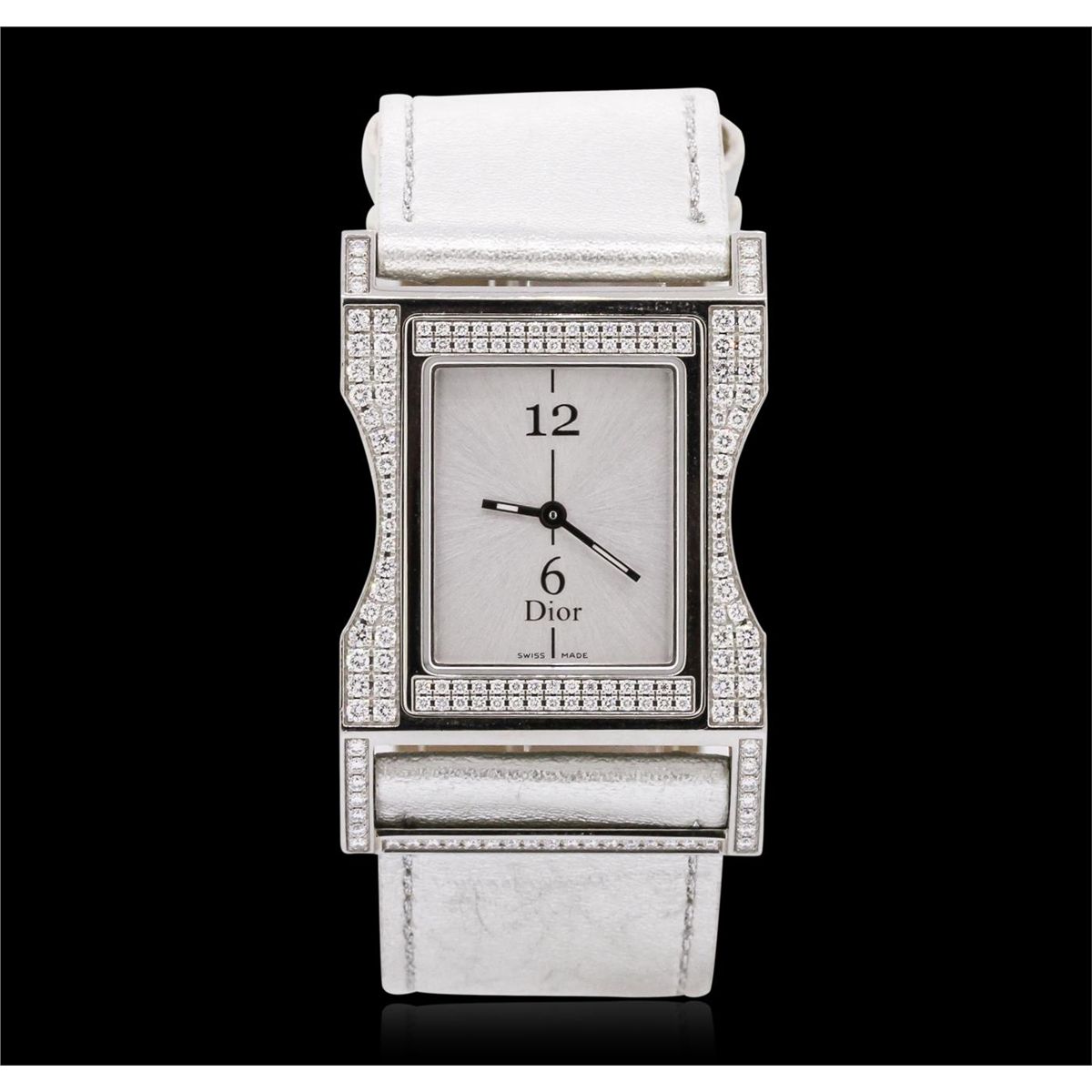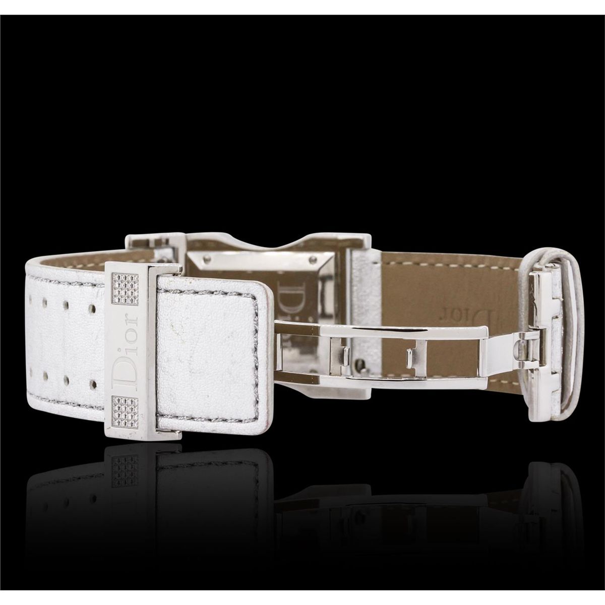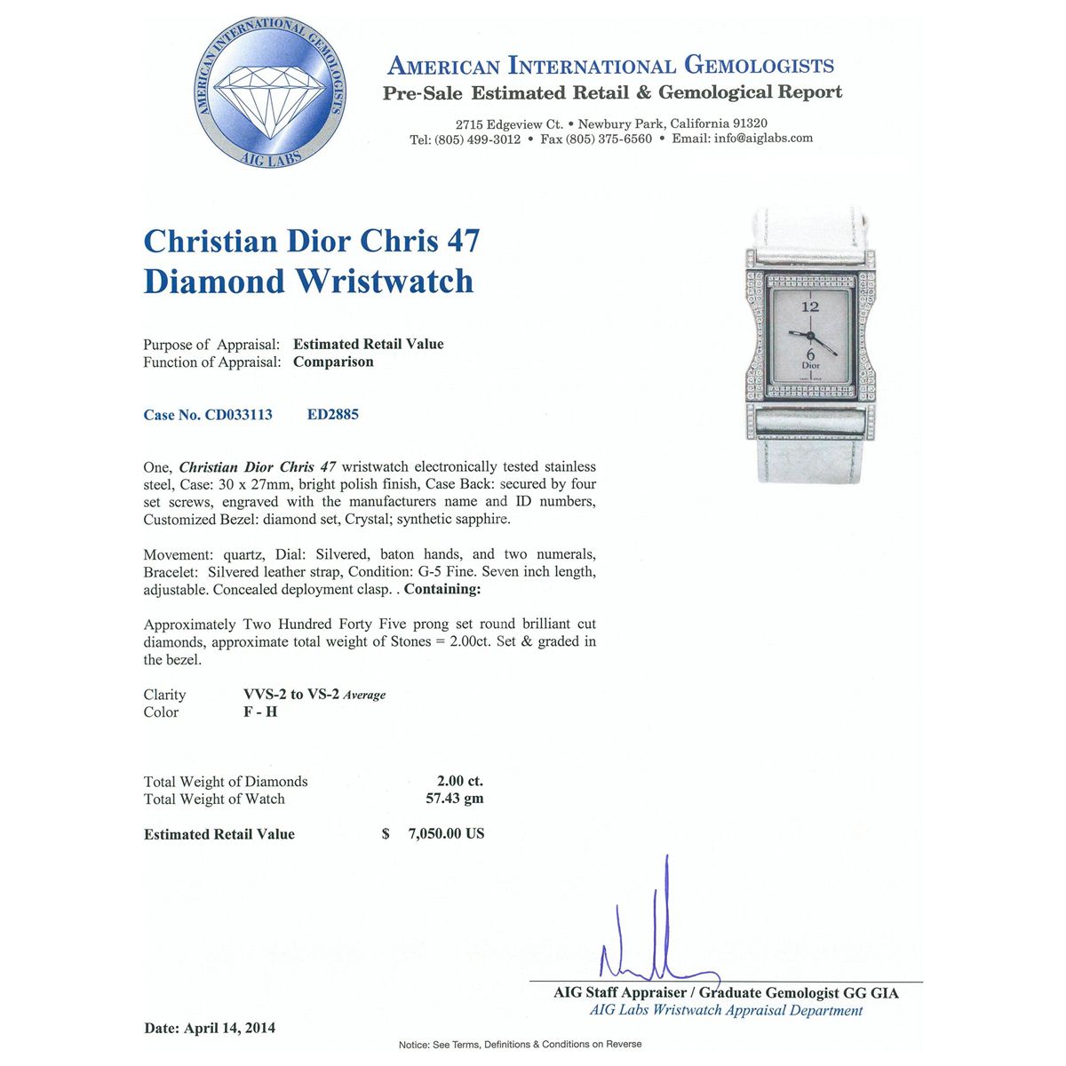 One, Christian Dior Chris 47 wristwatch electronically tested stainless steel, Case: 30 x 27mm, bright polish finish, Case Back: secured by four set screws, engraved with the manufacturers name and ID numbers, Customized Bezel: diamond set, Crystal; synthetic sapphire. Movement: quartz, Dial: Silvered, baton hands, and two numerals, Bracelet: Silvered leather strap, Condition: G-5 Fine. Seven inch length, adjustable. Concealed deployment clasp. Containing: Approximately Two Hundred Forty Five prong set round brilliant cut diamonds, approximate. Total Weight of Stones = 2.00ct. Set & graded in the bezel. Clarity: VVS-2 to VS-2 Average. Color: F - H. Total Weight of Diamonds 2.00ct. Total Weight of Watch AIG Appraised at $7,050.00.