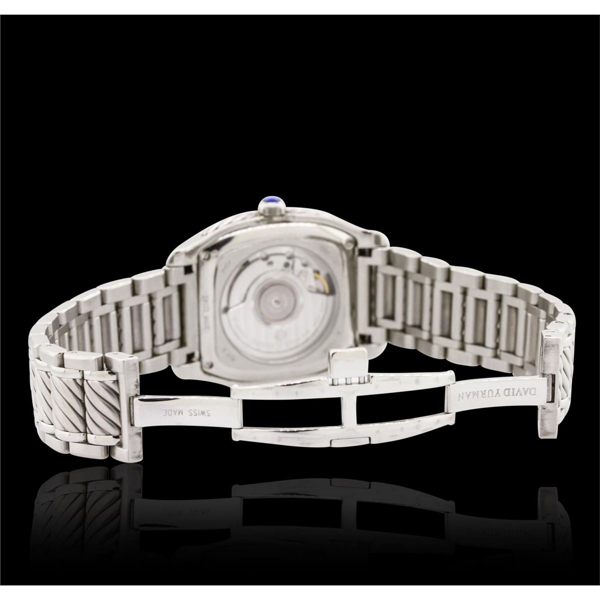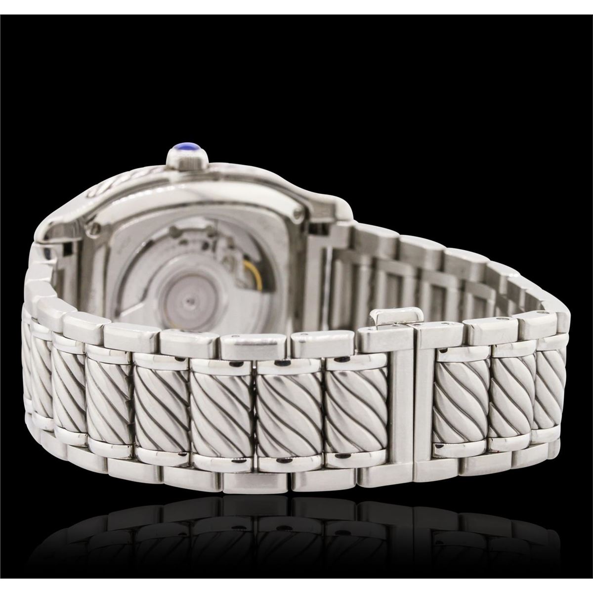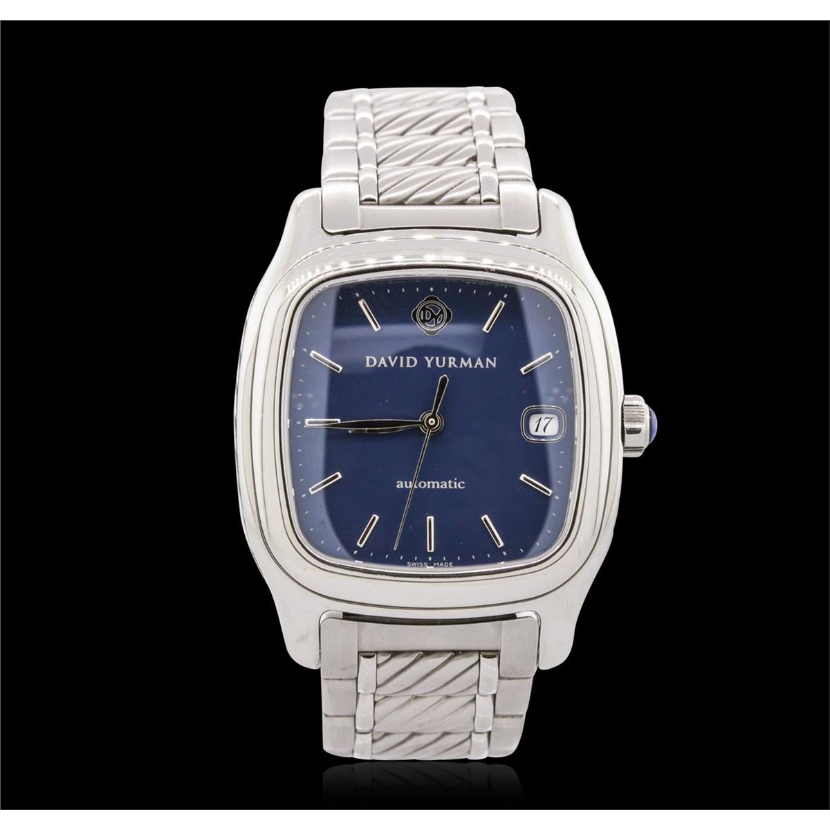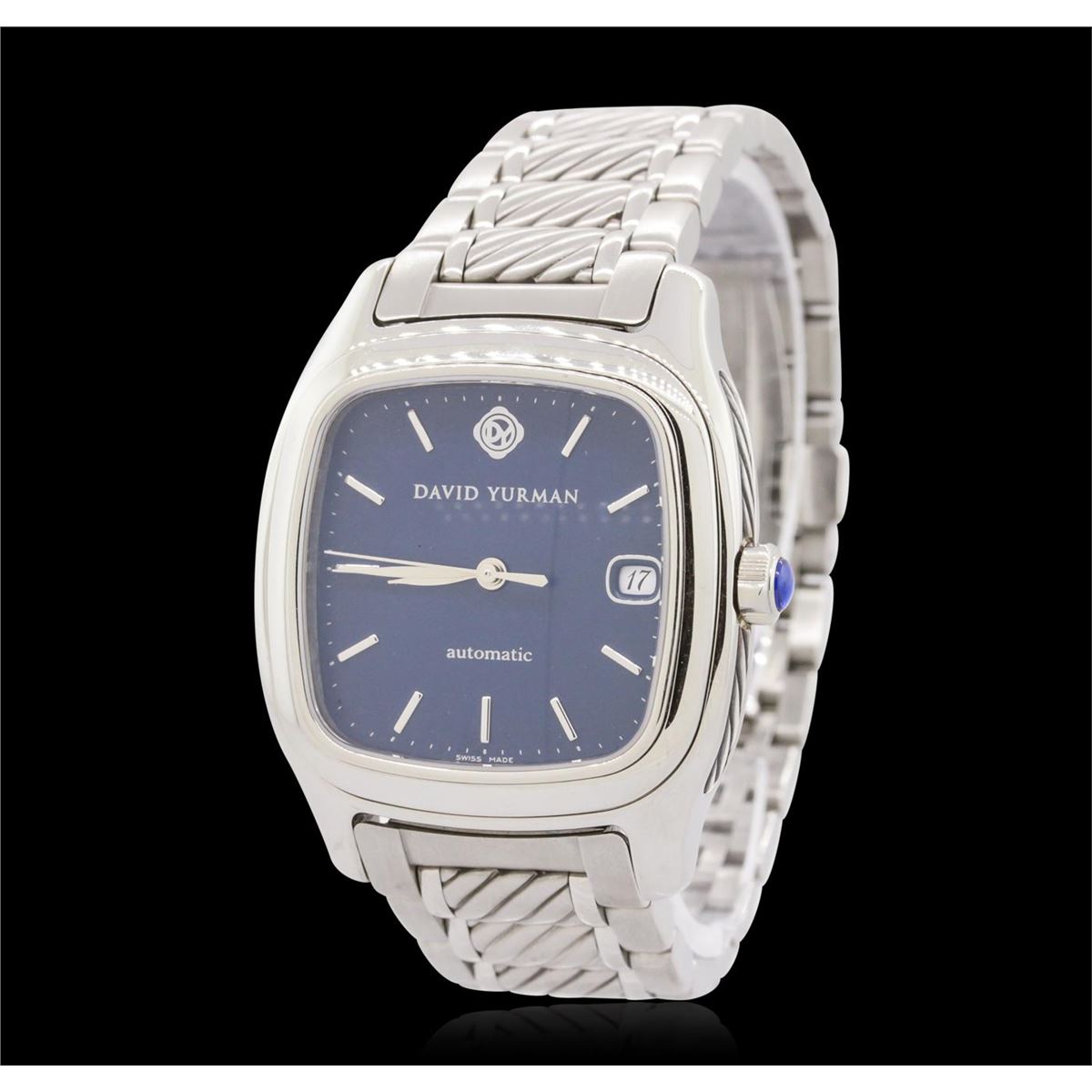 One David Yurman wristwatch featuring: Stainless Steel case, crown, lugs, bezel, and bracelet, blue dial with analog display, hour, minute, and second hands, hour markers, date at 3 o'clock position, Swiss automatic movement, deployment clasp. Case measures 38mm including crown.