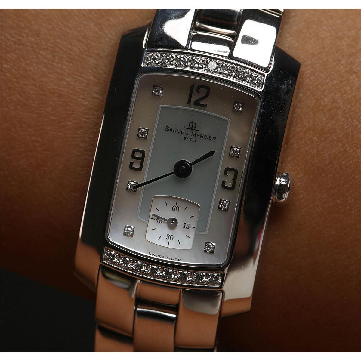 One wristwatch featuring: Stainless Steel bracelet, lugs, case and crown, Factory Diamond Bezel, gray mother of pearl dial with Arabic 12, 3, and 9, chronometer at 6 o'clock position, diamond hour markers, and deployment clasp. Item weighs a total of 90.90 grams, and measures 28mm across with crown.