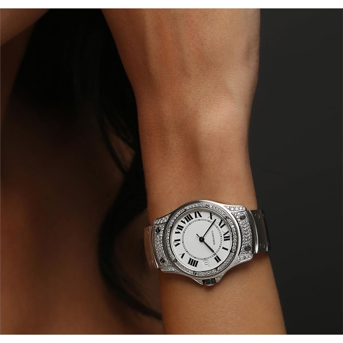 One wristwatch featuring: Stainless Steel Bracelet, Crown, and Lugs, Custom Diamond Case and Bezel, White Dial with analog display, black hour, minute, and second hands, date at 3 o'clock position, black Roman numerals, and deployment clasp. Item weighs a total of 90.70 grams, and measures 35mm across with crown.