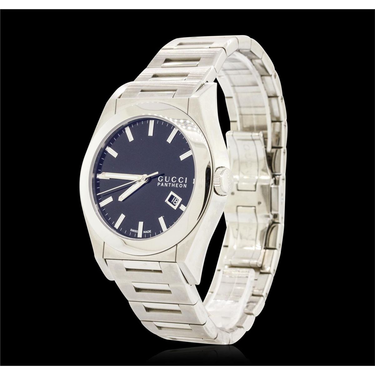 One Gucci Pantheon Wristwatch featuring: Swiss movement, Stainless Steel bracelet with deployment clasp, crown, case, lugs, and bezel, blue stix dial with hour and minute markers, hour and minute hands, date at 4 o'clock position.