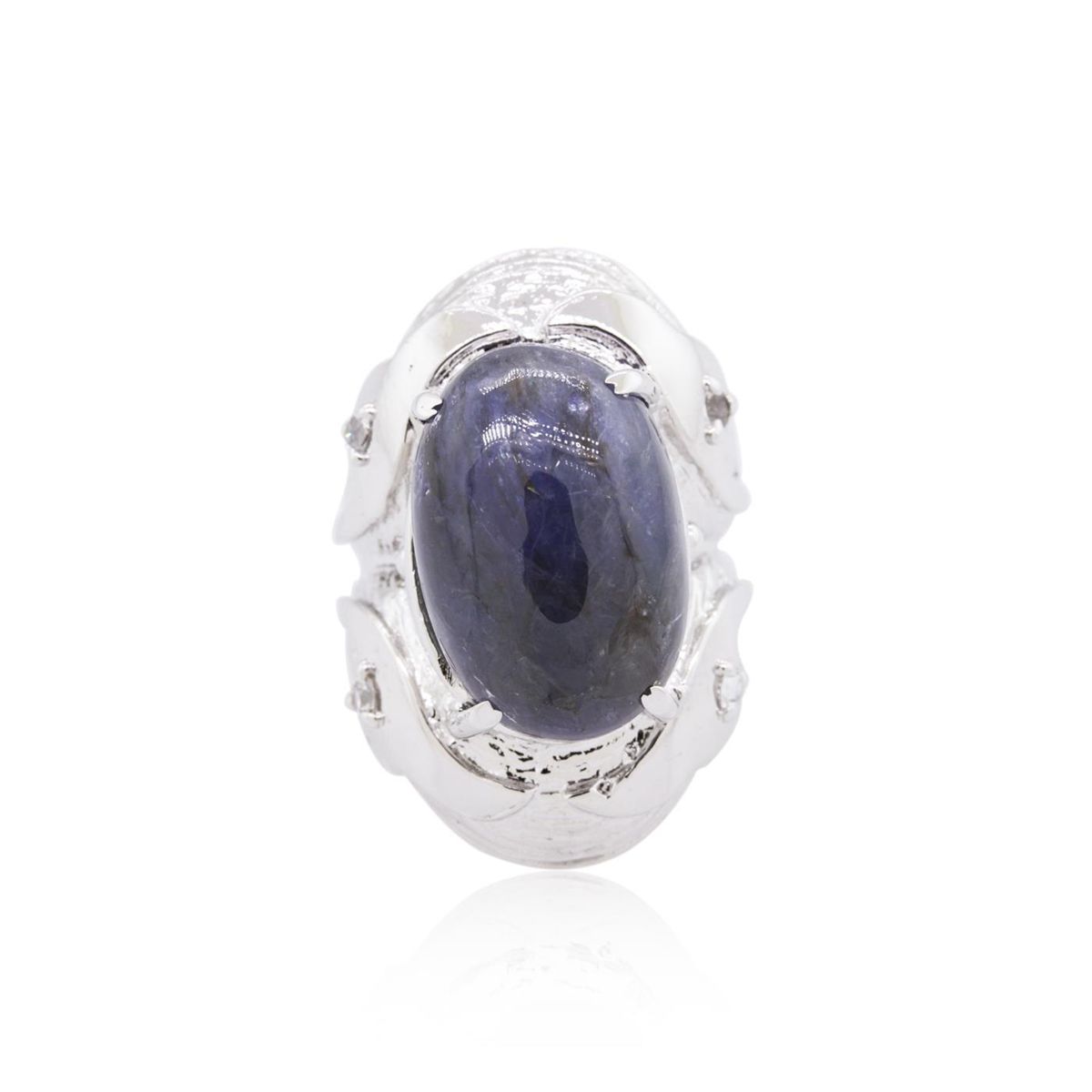 One electronically tested 925 silver ladies cast tanzanite and white sapphire ring with a bright polish finish. Condition is good. The featured tanzanite is set within elaborate patterned shoulders with white sapphire accents, completed by a four millimeter wide band. Identified with markings of "925". Containing: One prong set oval cabochon cut natural tanzanite, measuring 19.60 x 13.10 x 8.80mm, approximate weight of 22.04ct., clarity is severely included, type I, medium dark, very slightly grayish, violetish blue color, (GIA Vb 6/3), cut is good. Transmitting light with no distortion, transparent. Colored stone grading report attached. Graded in the setting. Tanzanite is a very rare gemstone that is only fund in the country of Tanzania. Originally discovered in 1967. Tiffany & Company, named the stone tanzanite. It is found in the Usumburu mountains that border the Umba valley of northern Tanzania. Tanzanite occurs in gray, brown, violet, blue, reddish-purple, & green. The gem is interesting because of its exceptional pleochroism. Rotated in different directions a tanzanite will exhibit multiple changes of color. Tanzanite has a low tolerance to ultrasonic cleaning, and should not be cleaned using this method. Total weight of Tanzanite 22.04ct. Total weight of Ring 15.93gm. AIG Appraised at $2,425.00.