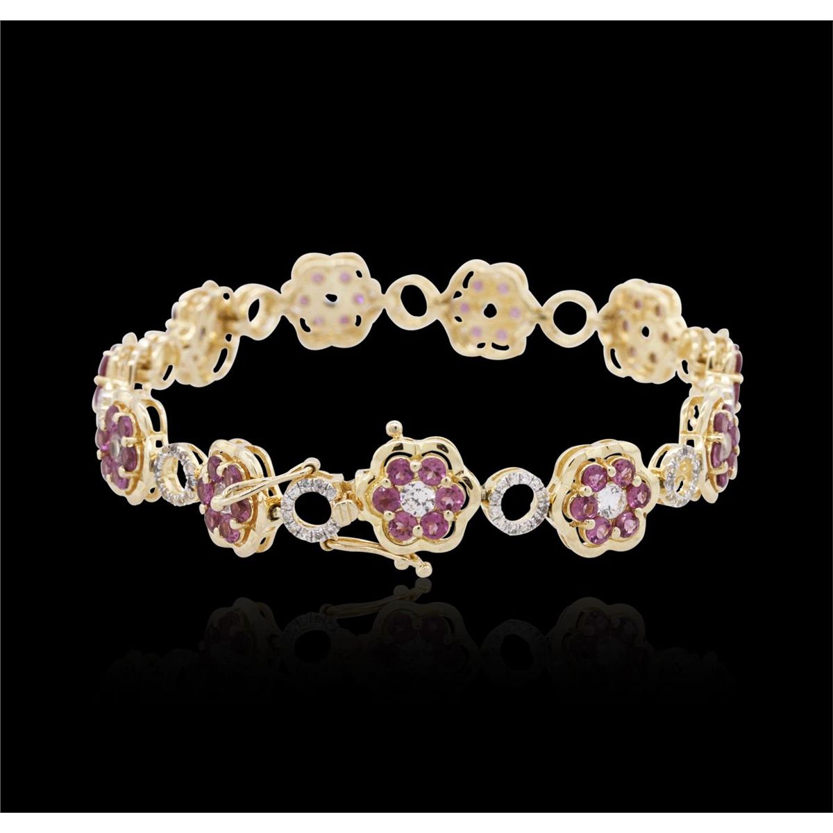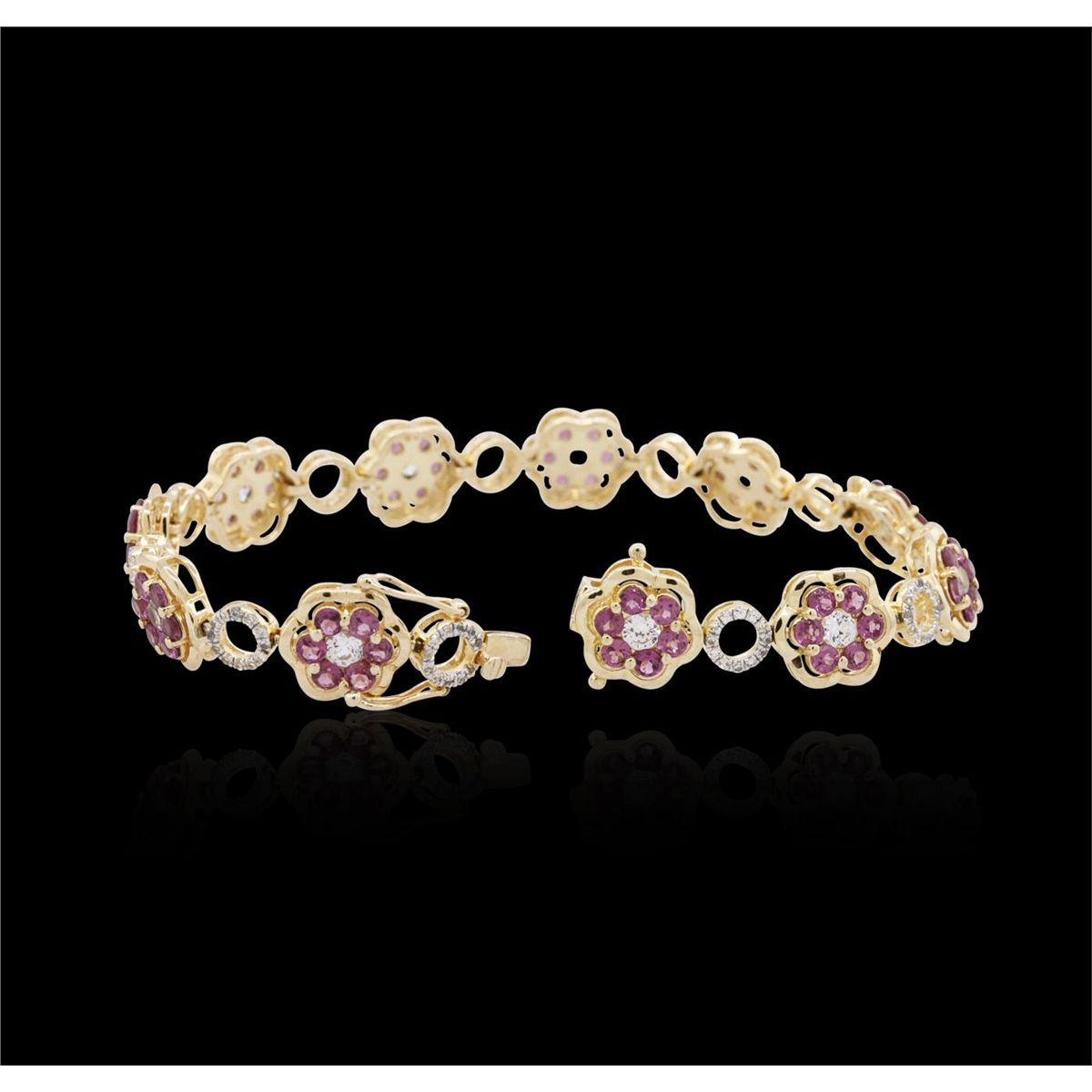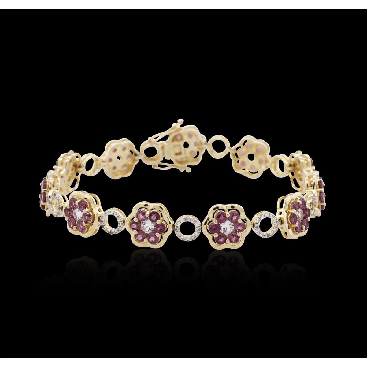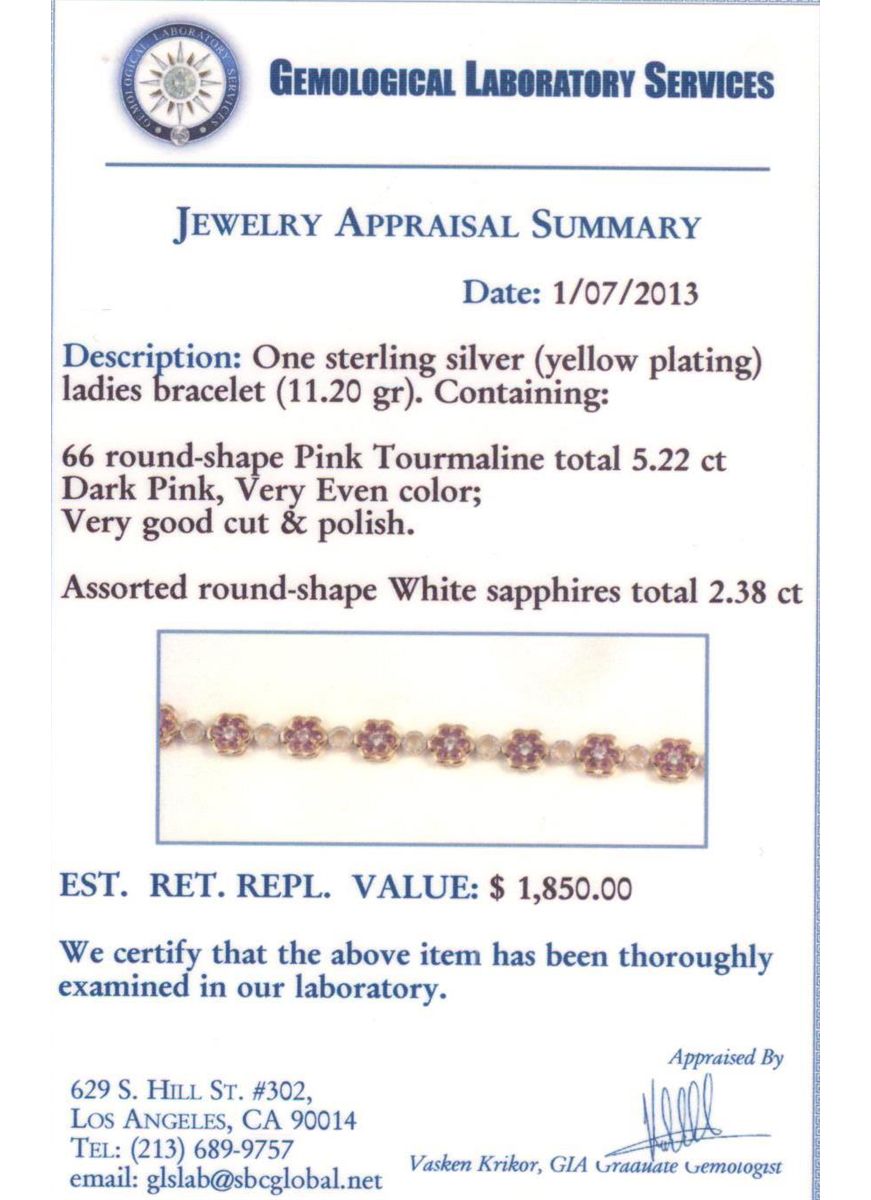 One sterling silver (yellow plating) ladies bracelet weighing 11.20 grams containing: 66 round shape pink tourmaline weighing 5.22ct, dark pink, very even color; very good cut & polish. The bracelet also features assorted round-shape white sapphires weigh