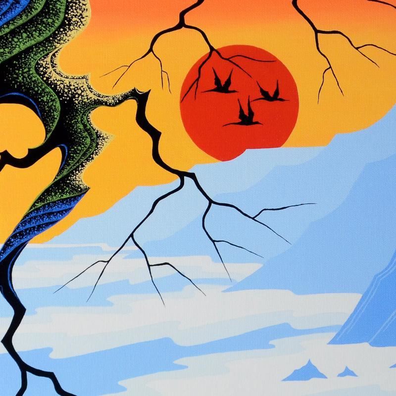 Larissa Holt, a student of distinguished artist Eyvind Earle(1916-2000), uses bold colors and breathtaking scenery to create images of Nature in her own unique style. "Sun Over Cliffs" is a limited edition giclee on stretched canvas by Holt, numbered and bearing Holt's authorized signature. This piece comes gallery wrapped with a black border, and is ready to hang. Includes Certificate of Authenticity! Measures approx. 27" x 22" x 1.5" (image).