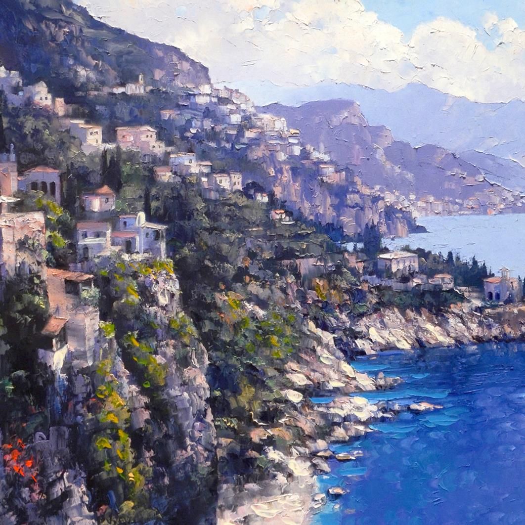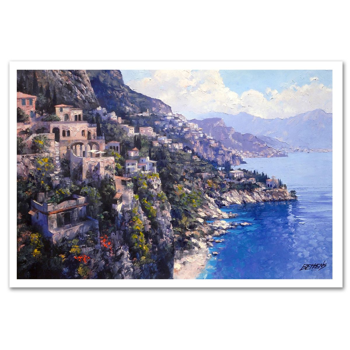 With bright colors and lush textures, Howard Behrens' (1933-2014) artwork adds a tropical and exotic feel to any art collection. "The Amalfi Coast" is a limited edition hand embellished giclee on canvas. Numbered 2 out of 50 and hand signed by the artist. Measures approx. 45" x 30" (image).