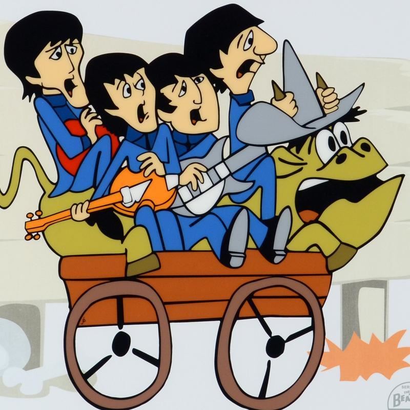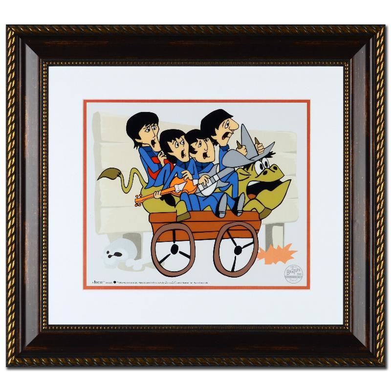 This must-have sericel re-creates a wacky scene from "The Beatles" Saturday morning cartoon series! "The Beatles: Bullride" is a limited edition sericel and bears the official DenniLu Company stamp! This piece has been framed and is ready to hang. Measures approx. 20.5" x 18.5" (framed); 12" x 10" (cel and background).