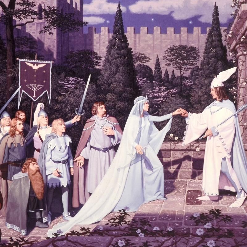 Known world wide for their fantasy and science fiction illustrations, identical twin brothers Greg and Tim Hildebrandt created an abundance of fascinating artwork, most notably their illustration work for J.R.R. Tolkien's 'The Hobbit' and 'Lord of the Rings'. "The Wedding Of The King", originally created in the 1970's for Ballantine Books, is a limited edition giclee on canvas, numbered and hand signed by Greg Hildebrandt! Measures approx. 28" x 21" (image).