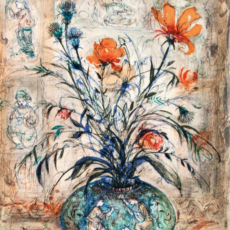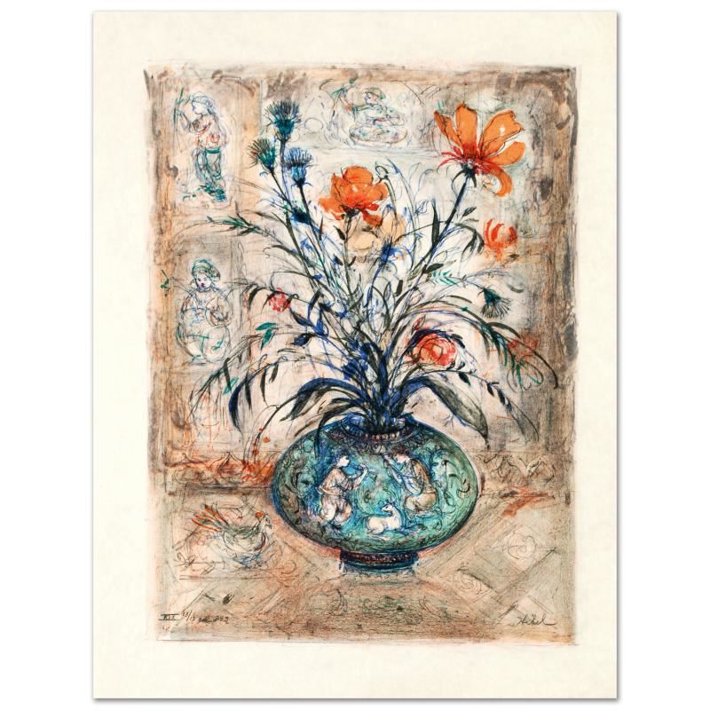 "Thistle Rose and a Day Lily" is a limited edition lithograph on rice paper, numbered and hand signed by Edna Hibel (1917-2014). Measures approx. 19.5" x 25.5" (with border), 15.5" x 21.5" (image).