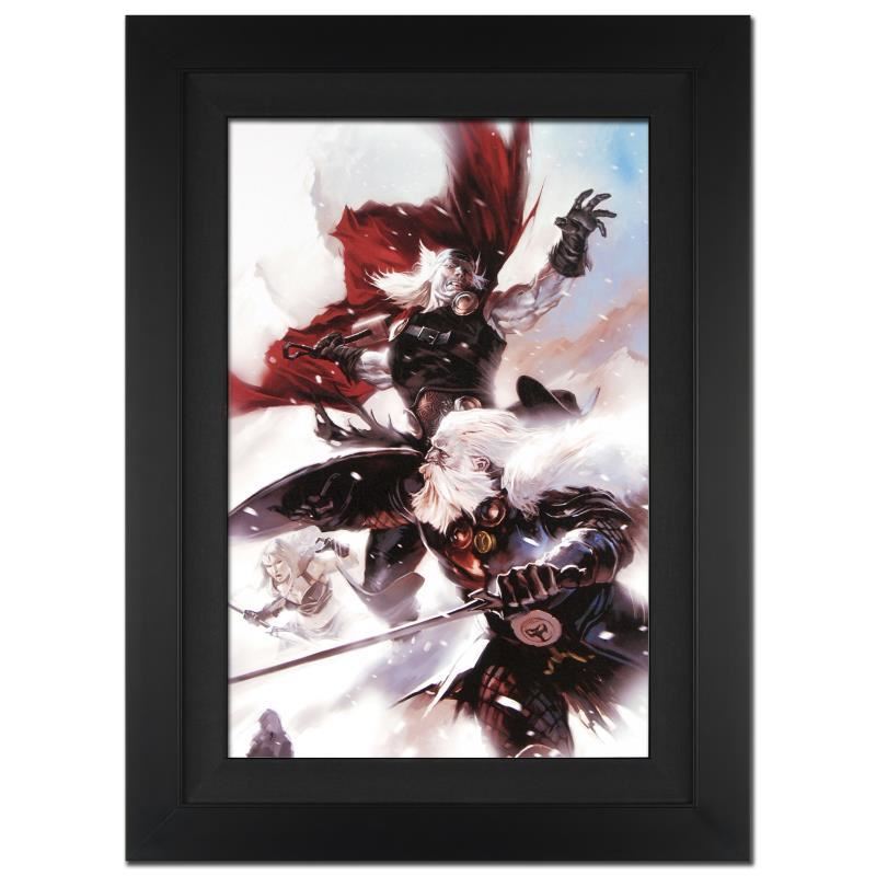 A piece of comic book history, this limited edition piece from art originally drawn by Clay Mann, depicts Thor and Odin in an epic battle. Clay Mann is a comic book artist currently working for Marvel Comics. Clay Mann's artistic endeavors include titles such as Daredevil, Dark Reign: Elektra, Heroes for Hire (vol 2) and X-Men: Legacy. "Thor: Man of War #1" is a limited edition giclee on canvas by Clay Mann presented by Marvel Comics, hand signed by the great Stan Lee and numbered out of only 10! This piece has been custom framed and ready to hang. Includes Certificate of Authenticity! Measures approx. 25" x 34" (with frame); 18" x 27" (image).