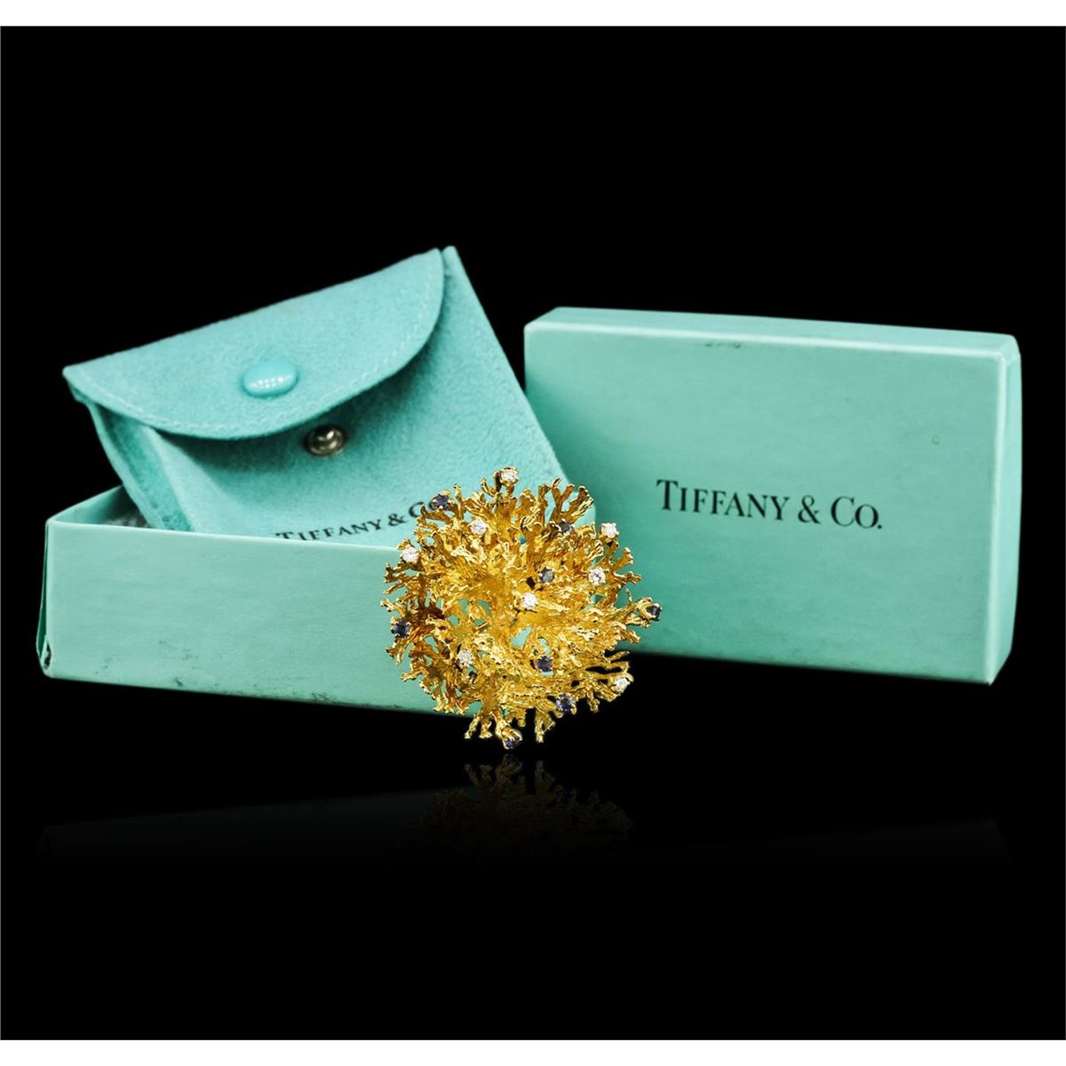 One electronically tested 18KT yellow gold ladies cast & assembled sapphire and diamond brooch/enhancer with a bright polish finish. The brooch/enhancer features a tufted branching design with intermittently placed sapphire and diamond accents, completed by a horizontally placed pin and vertically placed enhancer hook. Trademark is Tiffany & Co. Identified with markings of "18K". Condition is good. Containing: Eight prong set round brilliant cut natural blue sapphires, measuring 2.50 - 2.40 x 1.59 mm, approximate total weight of 0.74ct., clarity is slightly included, type II, medium dark, very slightly grayish, violetish blue color, (GIA vB 6/3), cut is good. Transmitting light with a minimum of distortion, transparent. Naturally occurring internal & external characteristics are present. Color grade is an average for the group. Graded in the setting. Eight prong set round brilliant cut diamonds, measuring 2.50 - 2.30 x 1.44mm (depth est.) approximate total weight of 8 Stones = 0.50ct. Graded in the setting. Clarity: VS-2 to SI-1. Color: F - G. Total Weight of Colored Stones 0.74ct. Total Weight of Diamonds 0.50ct. Total Weight of Brooch/Enhancer 23.10 grams. AIG Appraised at $4,290.00.