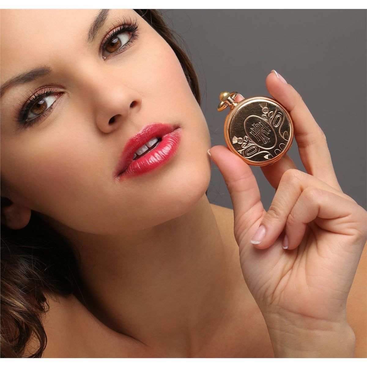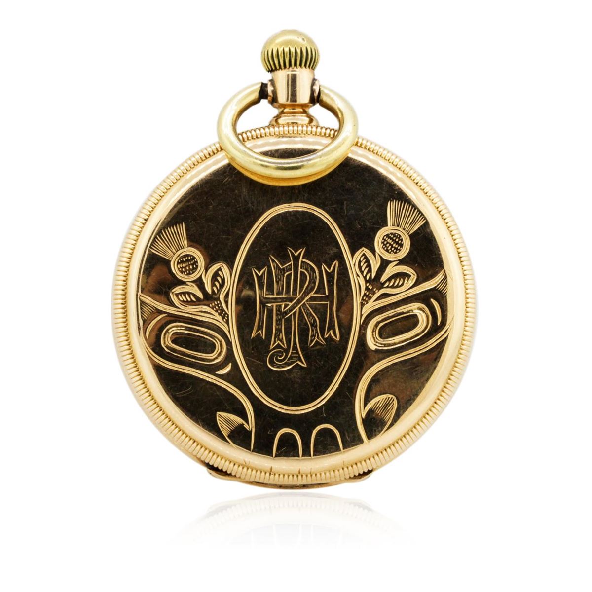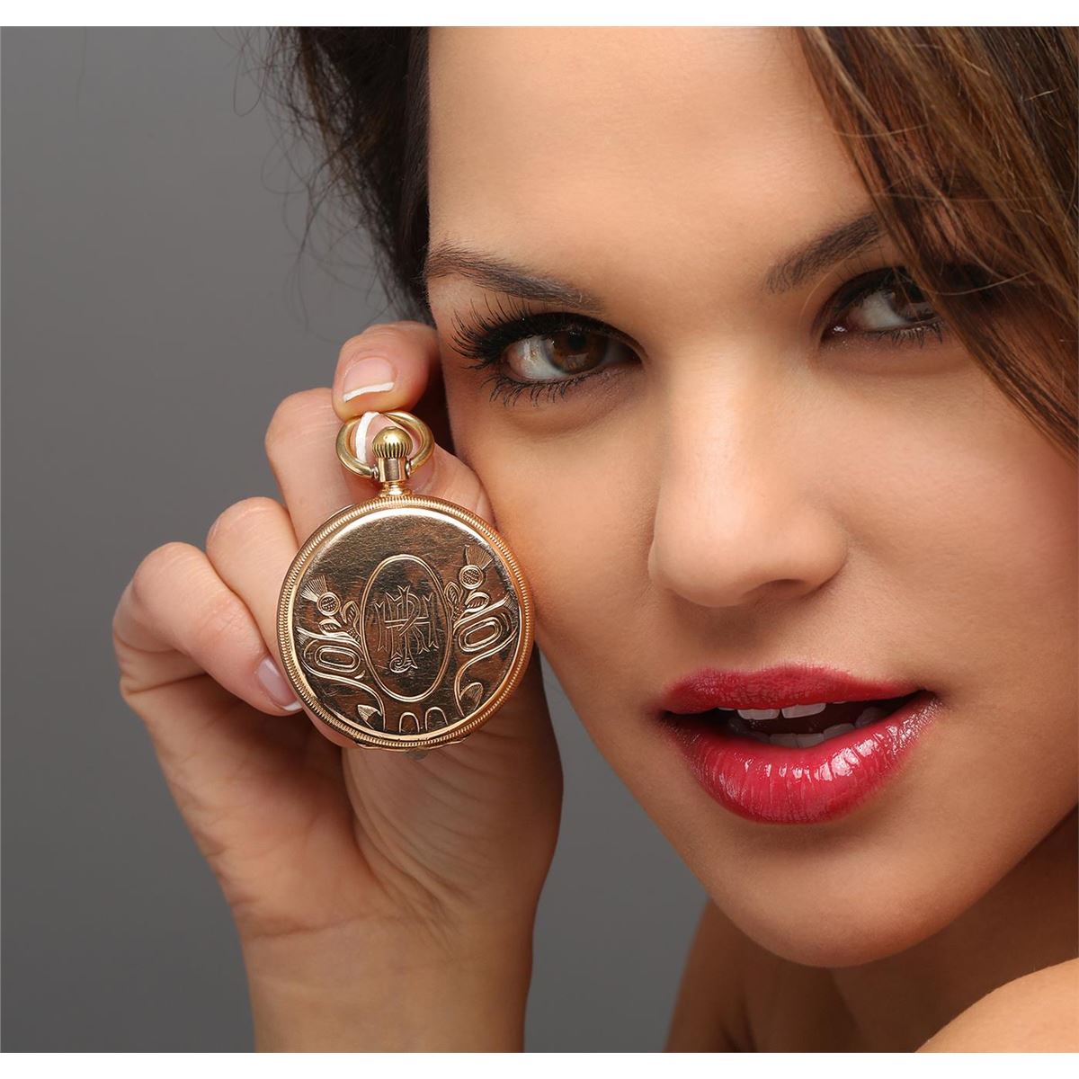 One, Tiffany & Co. full hunter pocket watch electronically tested 18KT yellow gold, Bezel: polished, Crystal: acrylic, Case: 47mm diameter, Case Cover: the outside of the case covers have a personalized engraving, Inside Movement Cover: acrylic exhibition. Movement: Tiffany & Co. mechanical, Signed Dial: White, with fuseaux hands, Roman numerals and a subsidiary second's sub dial at the 6 o'clock position, Condition: G-4 Average. Total Weight of Watch 93.92 grams. AIG Appraised at $4,980.00.