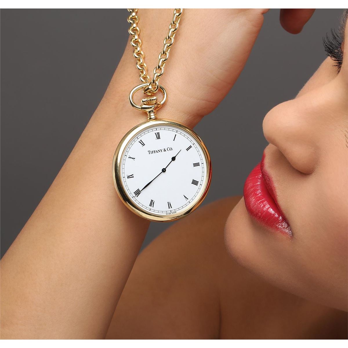 One, Tiffany & Co. open face pocket watch electronically tested 18KT yellow gold, Bezel: polished, Crystal: acrylic, Case: 49mm diameter, Case Back: a previously engraved personal message. Movement: Tiffany & Co. seven jewel quartz; Battery No. 395, Signed Dial: Porcelain White color, with fuseaux hands, and Roman numerals, Condition: G-6 Extra Fine. The pocket watch is attached to a Tiffany & Co. 18KT yellow gold twelve inch length, four millimeter wide link watch chain. Total Weight of Watch 57.66 grams. Total Weight of Chain 32.23 grams. AIG Appraised at $9,250.00.
