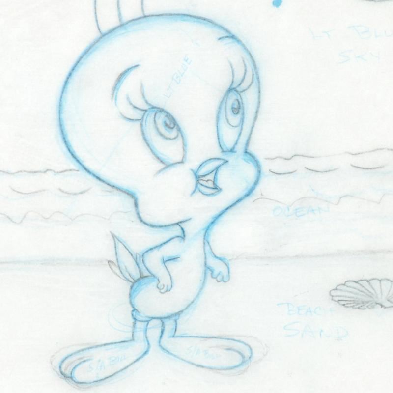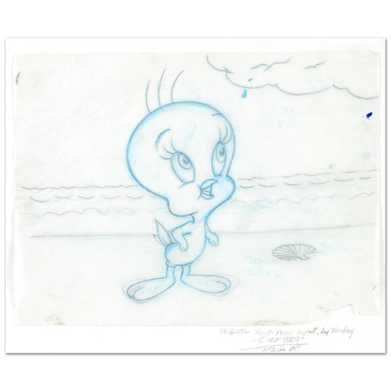"Tweety Bird" is an original pencil layout on paper circa 1990's by the renowned animator and cartoon director, Tom Ray (1919-2010)! This piece is hand signed by his widow, Brenda Ray. Measures approx. 12.5" x 10.5" (no border).