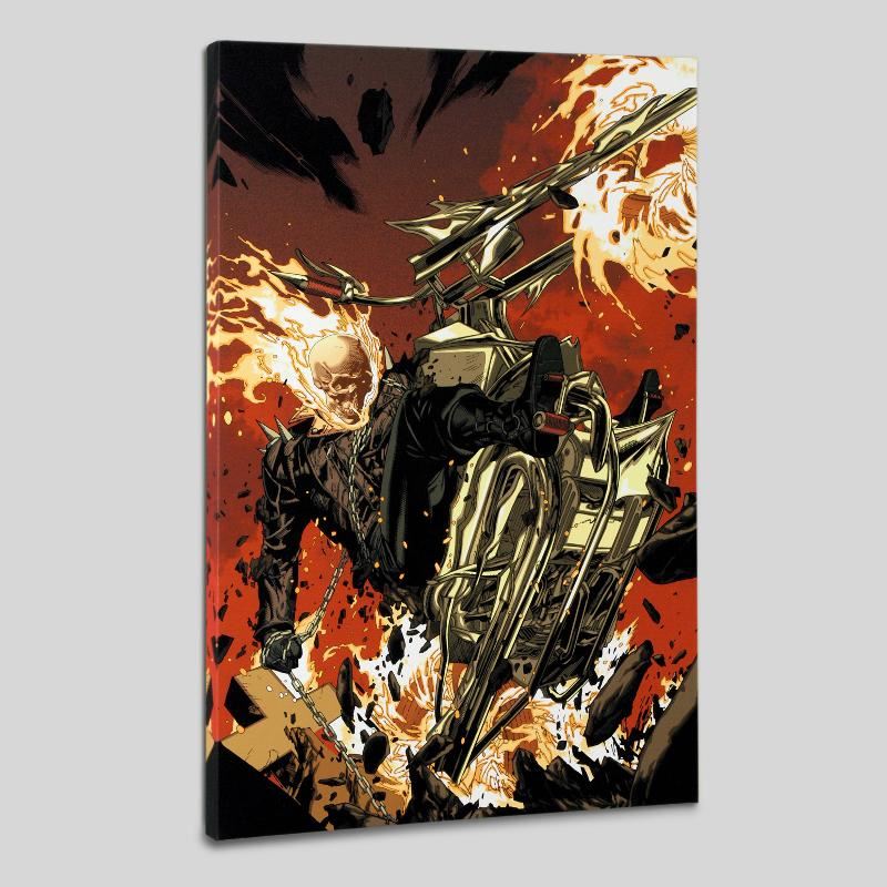 A piece of comic book history, this limited edition print, drawn by Leinil Francis Yu, depicts Ghost Rider in a fury of flames. After winning the Wizard's Drawing Board Contest, Marvel Comics hired Leinil Francis Yu to work on the Wolverine series. After his run on Wolverine he moved on to work on Marvel's core X-Men title in 2000. Yu continued to work on other Marvel titles such as Fantastic Four, Ultimate Wolverine vs. Hulk and New Avengers. "Ultimate Avengers 2 #4" is a limited edition numbered giclee on canvas by Leinil Francis Yu presented by Marvel Comics. This piece comes gallery wrapped and ready to hang. Measure approx. 18" x 27" (image).