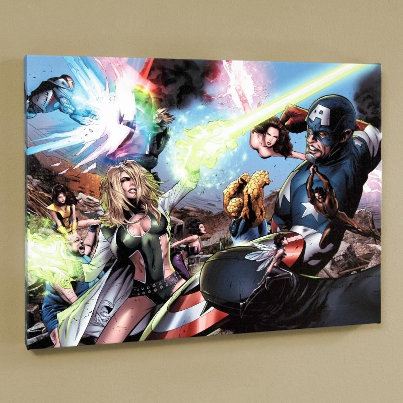 A piece of comic book history, this limited edition print, drawn by Greg Land, depicts Scarlet Witch, Captain America, Thing, Wasp, Shadowcat, Power Princess, Arcanna, Dr. Spectrum, Nighthawk, and Tom Thumb. Greg Land got his start as an illustrator for an independent publisher. After landing a job at Marvel, Land has produced illustrations for X-Men and the Fantastic Four, among others. "Ultimate Power #6" is a limited edition numbered giclee on stretched canvas by Greg Land presented by Marvel Comics. This piece comes gallery wrapped and ready to hang. Includes Certificate of Authenticity! Measures approx. 24" x 18" (image); 1.5" (depth).