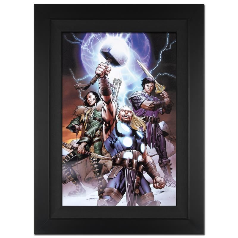 A piece of comic book history, this limited edition piece from art originally drawn by Carlos Pacheco, depicts Thor, Loki, and Balder. Pacheco first got attention in the United States for his work as penciller on Dark Guard, a Marvel UK title. This led to him being offered work by American comic editors leading to Marvel Comics' 1994 Bishop. Pacheco's art had become a fan favorite, with his work regularly getting coverage in magazines such as Wizard. In early 1997 Marvel acknowledged this by assigning Pacheco to one of its flagship titles, X-Men. In 2009, Pacheco signed an exclusive contract with Marvel. "Ultimate Thor #3" is a limited edition numbered giclee on canvas by Carlos Pacheco presented by Marvel Comics, hand signed by the great Stan Lee and numbered out of only 10! This piece has been custom framed and ready to hang. Includes Certificate of Authenticity! Measures approx. 25" x 34" (with frame); 18" x 27" (image).