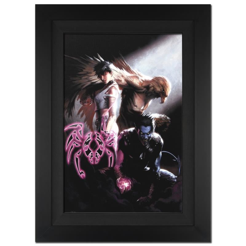A piece of comic book history, this limited edition piece from art originally drawn by Gabriele Dell'Otto, depicts an intense trio of Nightcrawler, Angel and Dazzler. In 1998 Dell'Otto started collaborating with the European division of Marvel Comics, producing covers, posters and lithographies for Italy, France and Germany. In 2002, his work was shown to the editor-in-chief of Marvel Comics, who entrusted to him with the art for the Secret War mini-series. "Ultimate X-Men #95" is a limited edition giclee on canvas by Gabriele Dell'Otto presented by Marvel Comics, hand signed by the great Stan Lee and numbered out of only 10! This piece has been custom framed and ready to hang. Measures approx. 25" x 34" (with frame); 18" x 27" (image).