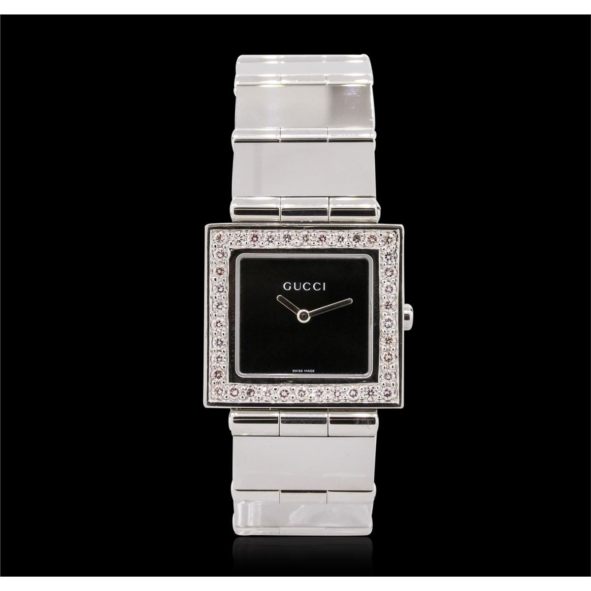 One unisex Gucci 600m Casual Style Wristwatch featuring: Square Factory Diamond Stainless Steel Bezel, Stainless Steel 30mm Case, Bracelet, Lugs, and Pull/Push Crown, Black Dial Analog Display with Hour and Minute Hands, Gucci marking at 12 o'clock position, no numbers, deployment clasp, Quartz Battery Movement, Sapphire Crystal, Screw-in (4 screw) Case Back, Water Resistant to 30m/99ft.