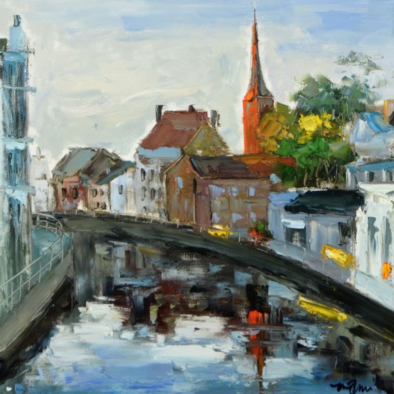 "Waterway IV" is an original oil painting on canvas by Mani, hand signed by the artist. Measures approx. 30" x 30" (image).