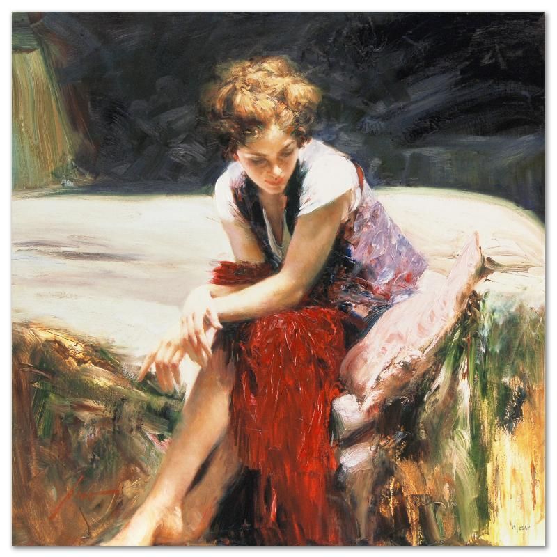 Pino's portraits allow glimpses into intensely personal, intimate spaces, conveying emotion through rich, warm color and sensual brushwork. "Whispering Heart" is a limited edition giclee on stretched canvas that has been hand-embellished by Pino himself, AP numbered and hand signed by Pino (1939-2010). Measures approx. 28" x 28" (image).