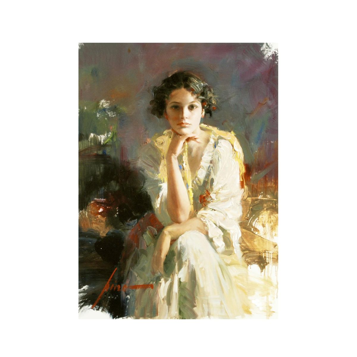 Pino's portraits allow glimpses into intensely personal, intimate spaces, conveying emotion through rich, warm color and sensual brushwork. "Yellow Shawl" is a limited edition giclee on canvas that has been hand-embellished by Pino himself, AP numbered and hand signed by Pino (1939-2010). Measures approx. 10" x 14" (image).
